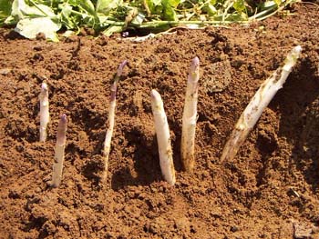作り方は、意外に簡単だ。ホワイトにするには、太陽光が当たらないよう土盛りをするだけなのだ。私は現物を見たことはないが、ヨーロッパでは上部が緑で下は白と、1本で2色のアスパラも作っているそうだ。