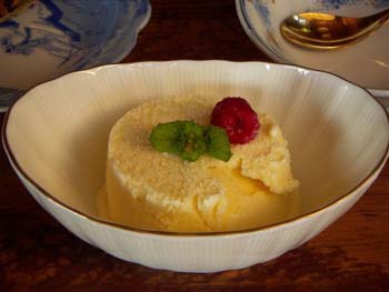 「サカタのタネ」の皆さんには、ヴァニラアイスクリームに載せ、ミントの葉を添えて出した。ラズベリーのわずかな酸味が、ヴァニラアイスの甘さを引き立たせてくれて、これが、うまい!