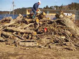 私が選んだのは、椿の木だ。毎年たくさんの花を咲かせる椿が土手にあったのだが、これも河川改修のために切られてしまった。その枝の太いところをチェーンソーで斜めに切って、鉄のクサビで広げた大木の切り口に差し込み、赤穂浪士が吉良邸に討ち入ったときのような「かけや」(打ち出の小槌の大きいような物)を、上から数回思い切り打ち下ろしたら、「ベキベキ」と大きな音を立てて大木の端が落ちた。