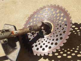 従来の草刈り機は、丸い鉄ののこぎり刃が回転して草を刈る。これだと、少々茎の硬い草も、細い竹でも刈り払うことができる。前の「日記」で写真をお見せした作業中の私が使っていたのが、このタイプだ。しかし、危険な機械でもある。ゴーグルをしているのは、回転刃が小石を跳ね飛ばしたり、石にあたった刃が小さく欠けたりして、自分の方へ飛んでくることがあるからだ。