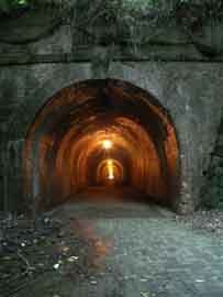 明治のトンネルは、江戸時代に峠を越える旅人が一服した宇津ノ谷集落のすぐ上にある。交通量が増えて、峠を越えるのが不便だからと明治7年(1874)、地元の有志が結社を作ってトンネル掘削に着手し、明治9年、日本で初めての有料トンネルとして開通した。当初は途中で「く」の字に曲がったトンネルだったが、明治29年に火災で木製の支柱が焼失したため、半分を掘り直して直線にし、明治37年、長さ203メートルの赤レンガ造りのトンネルになった。