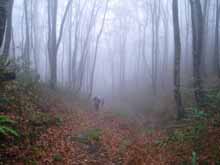 今にも降り出しそうな空だが気温はそれほど低くはない。横手高校の正面入り口から左に折れ、グングン山の中に入っていく。かなり高度を稼いでようやく「追分の一本杉」のある一の坂登山口に到着。霧というかガスがかかって眼下の町がまるで湖水に沈んだように幻想的に見える。 まずは横手市側にある御嶽山の山頂を目指し、そこからさらに黒森山に抜け、黒森川の登山口に降りてくる縦走登山だ。 落ち葉の敷き詰められたフカフカの極楽ロード。登山道はかなり湿っているので本来ならスパイク長靴が正解なのだが、最近お気に入りのキャラバンシューズ(安くて軽くてフィット感抜群なのだが滑りやすい)を選んだ。靴の選択も山歩きには重要な意味がある。 11月月に入って八塩山、雄長子内岳といずれも予想以上に紅葉が全盛で「得した気分」を味わったが、今日の御嶽山はほとんどのブナの葉は落ちて木々は裸。それでも雨霞の中のもやったブナ林は幻想的でこの上なく美しかった。靄に煙る葉を落としたブナ林は天に屹立する城郭のような佇まいだ。