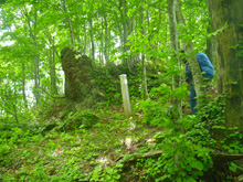 その恐れは当たらずとも遠からず。登山道に昨日あたりしたとおもわれるでっかいクマの糞。真っ黒なやつで、タケノコや繊維質のものを食べている痕が、くっきりと糞に見て取れた。すぐ横の木の標柱もガリガリとかじりとられていた。2週間前にはなかった噛み跡だ。「いい気になるなよ、ここは俺の縄張りだ」とクマが自己主張している。やはりクマはいたのだ。姿こそ見なかったが、もうひとりでこの山には入れない。 |