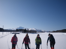 湿原をスノーシューで歩くハイキング。冬師湿原の冬のハイキングは毎年恒例になっているのだが、真っ平らな平原をひたすら歩き続けるだけでなく、鳥海山が身近で、それを見ながら歩ける絶好のロケーションもその魅力だ。平原といっても歩いてみると、けっこう小さなアップダウンが続く。地図で見ると小高い丘の標高が400メートル台もあって、この湿原自体が鳥海山麓の高台にあることがわかる。 このへんいったいは広大な牧野になっている。火山灰地なので田んぼにはできなかった場所だが、ここをぐるりと1周すると約6キロ。5時間ほどかけて回ってきた。 それにしても昨日の雲ひとつない、青空にそびえるまぢかな鳥海山は圧巻だった。文字通り本当に「雲ひとつない」のだから、こんなことは地元の人にも珍しいのではないだろうか。森の中で三脚を立てて山の写真を撮っていた人に訊くと、「雲がないとアクセントがないので単調な山しか撮れない」と不満たらたらだった。